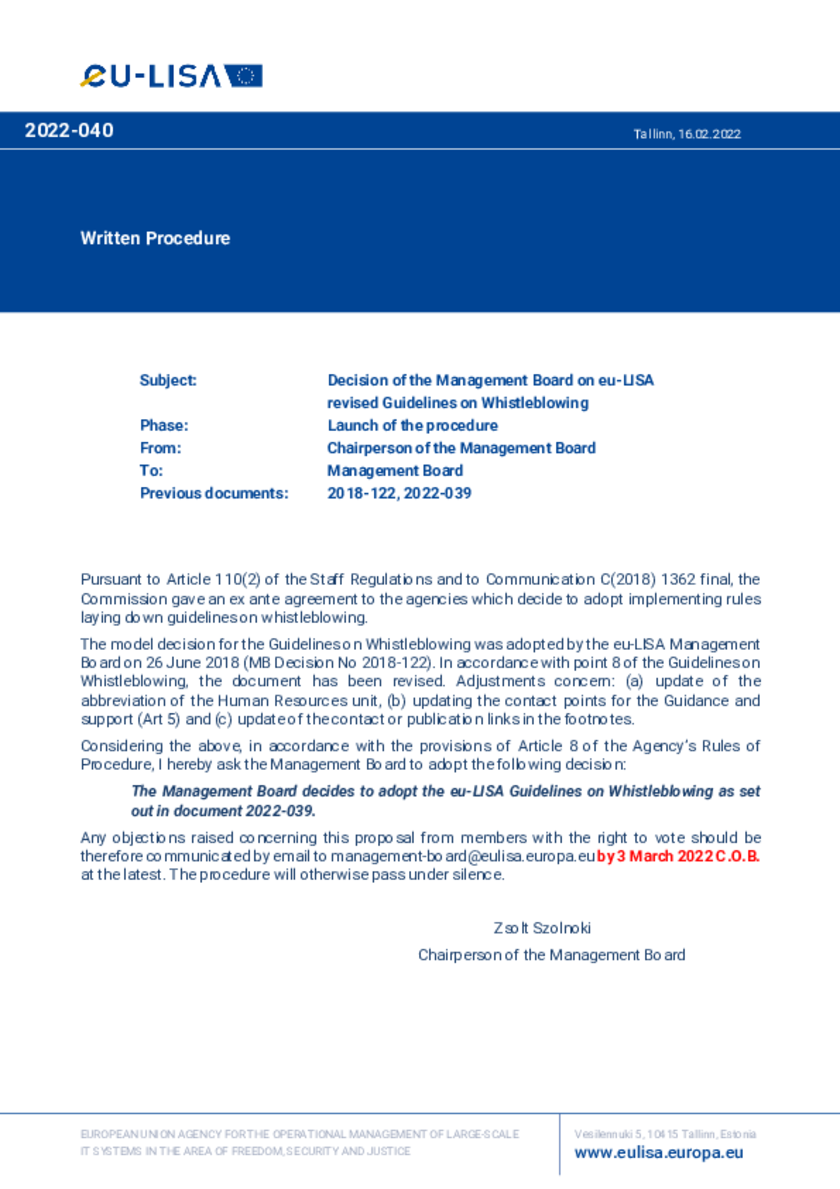 2022-040 Decision of the Management Board on eu-LISA revised Guidelines on Whistleblowing