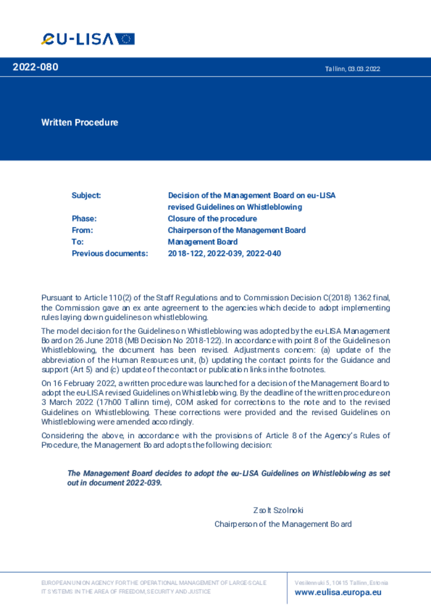 2022-080 Decision of the Management Board on eu-LISA revised Guidelines on Whistleblowing
