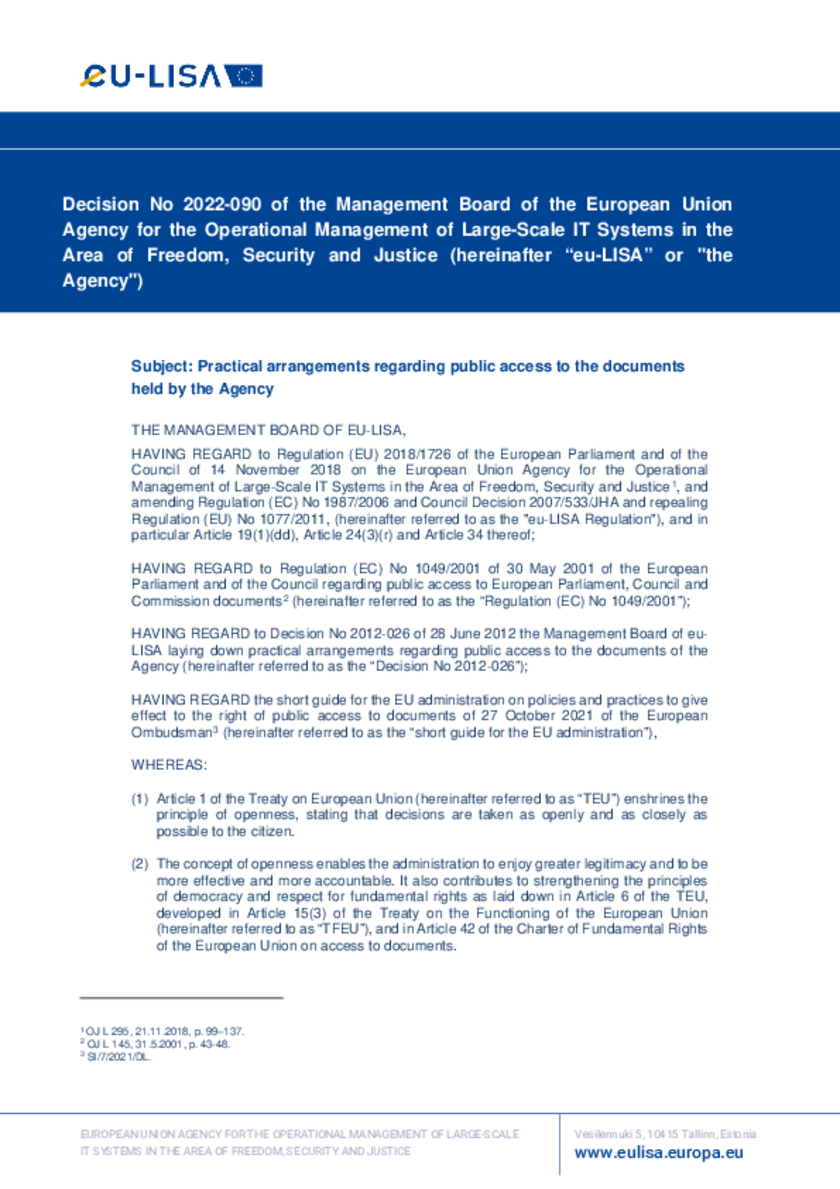 2022-090 Decision of the Management Board on the practical arrangements regarding public access to the documents held by the Agency