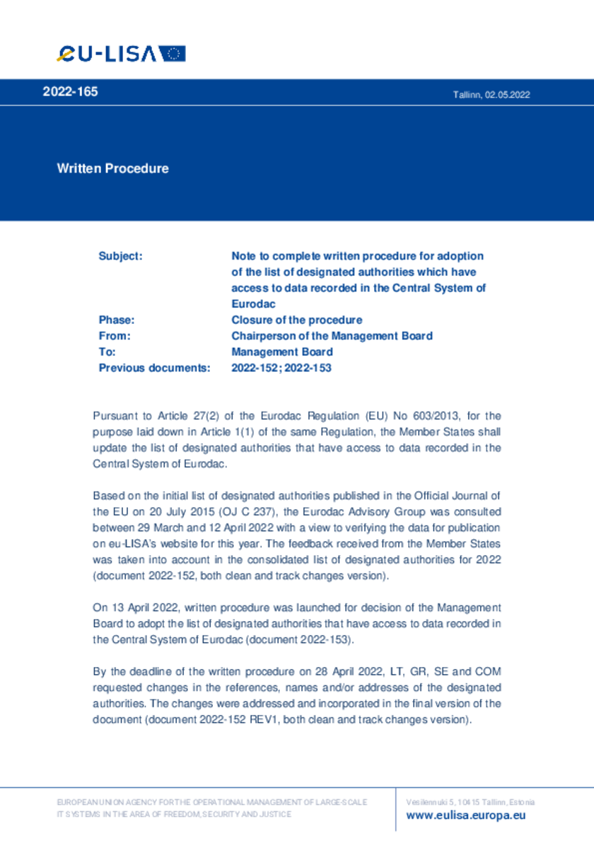 2022-165 Note to complete written procedure for adoption of the list of designated authorities which have access to data recorded in the Central System of Eurodac