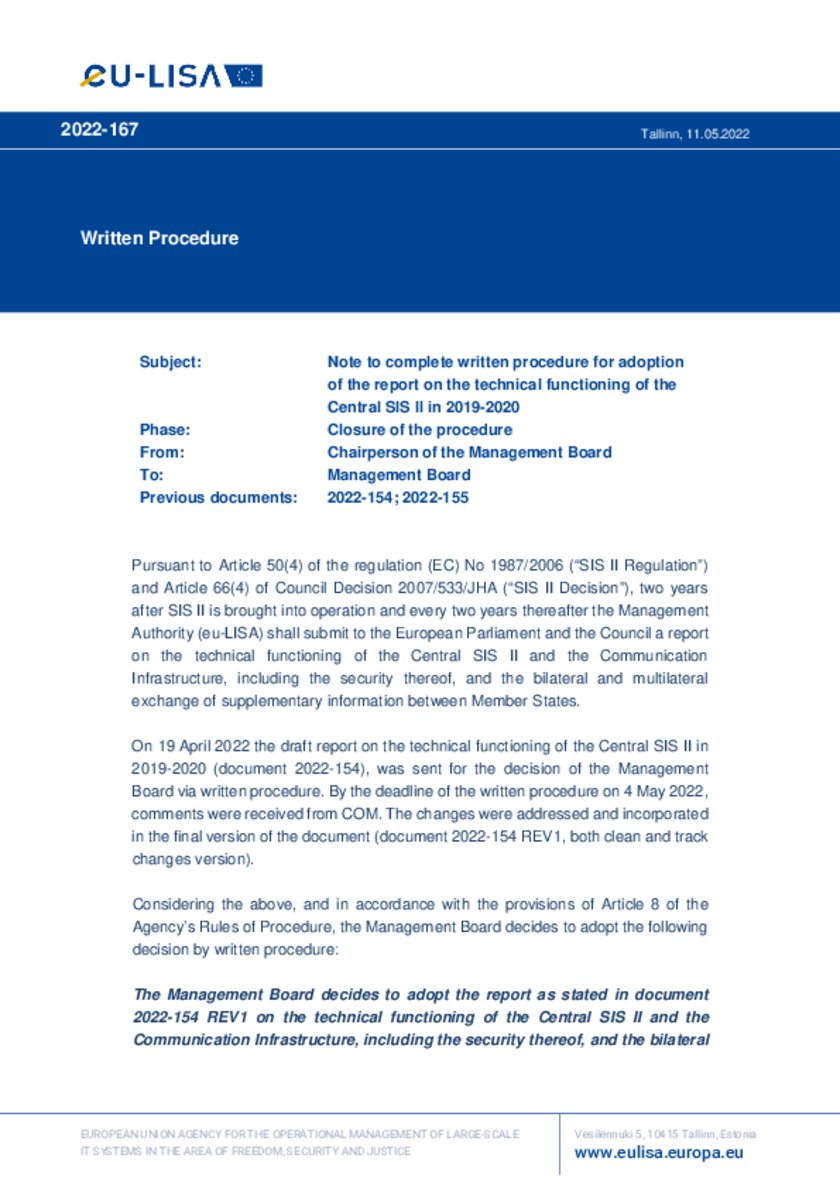 2022-167 Note to complete written procedure for adoption of the report on the technical functioning of the Central SIS II in 2019-2020