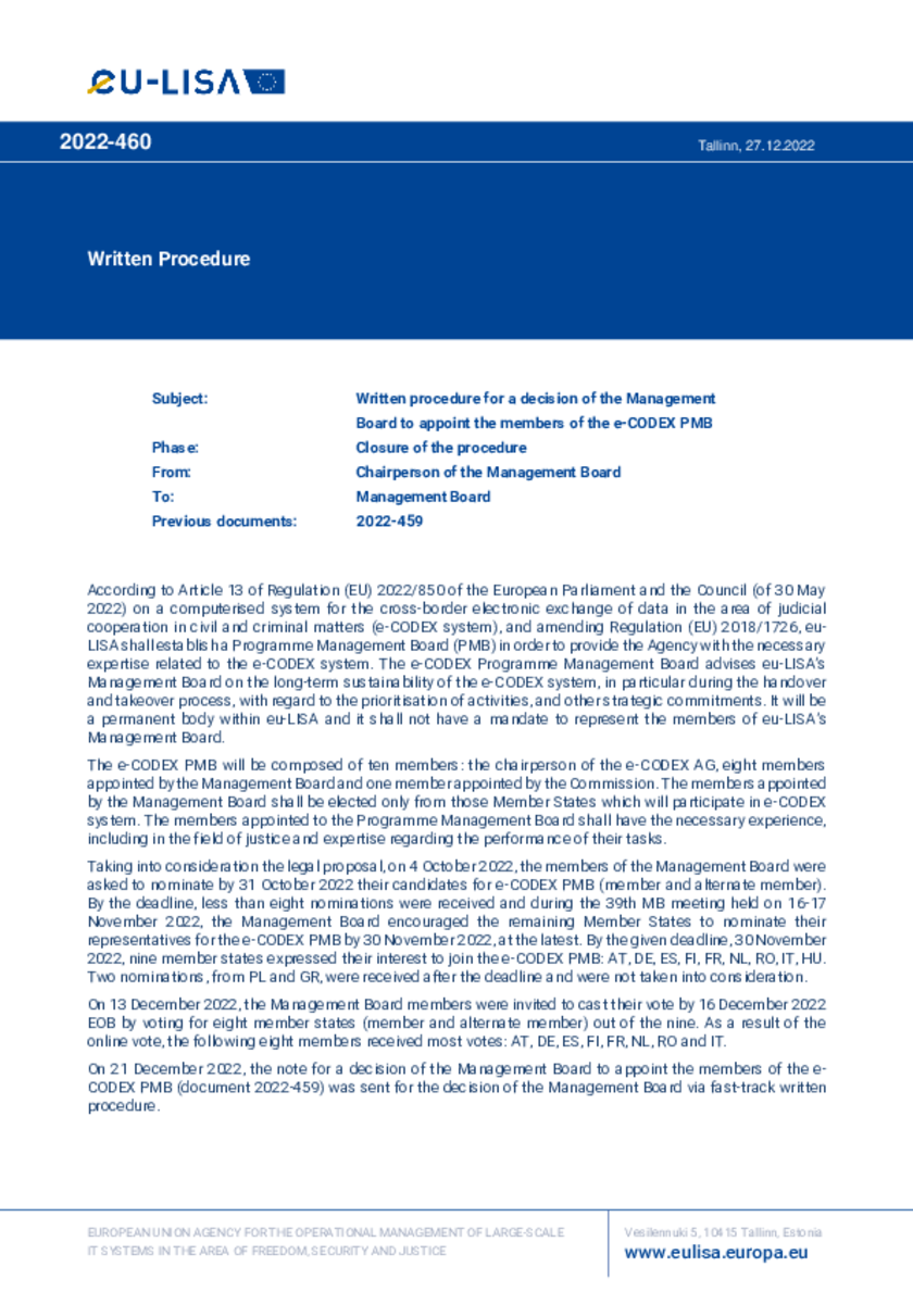 2022-460 Written procedure for a decision of the Management Board to appoint the members of the e-CODEX Programme Management Board