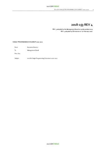The aim of the Single Programming Document 2020-2022 of the European Union Agency for the Operational Management of Large-Scale IT Systems in the Area of Freedom, Security and Justice (eu-LISA) is to guide and streamline the Agency’s efforts in 2020, as well as to provide a longer-term view – until 2022 – of planned activities and projects for its internal and external stakeholders. It has been designed to align financial and human resources with the legally-binding activities stemming from the Agency’s establishing Regulation and with the strategic goals and objectives set in the Agency’s long-term strategy.