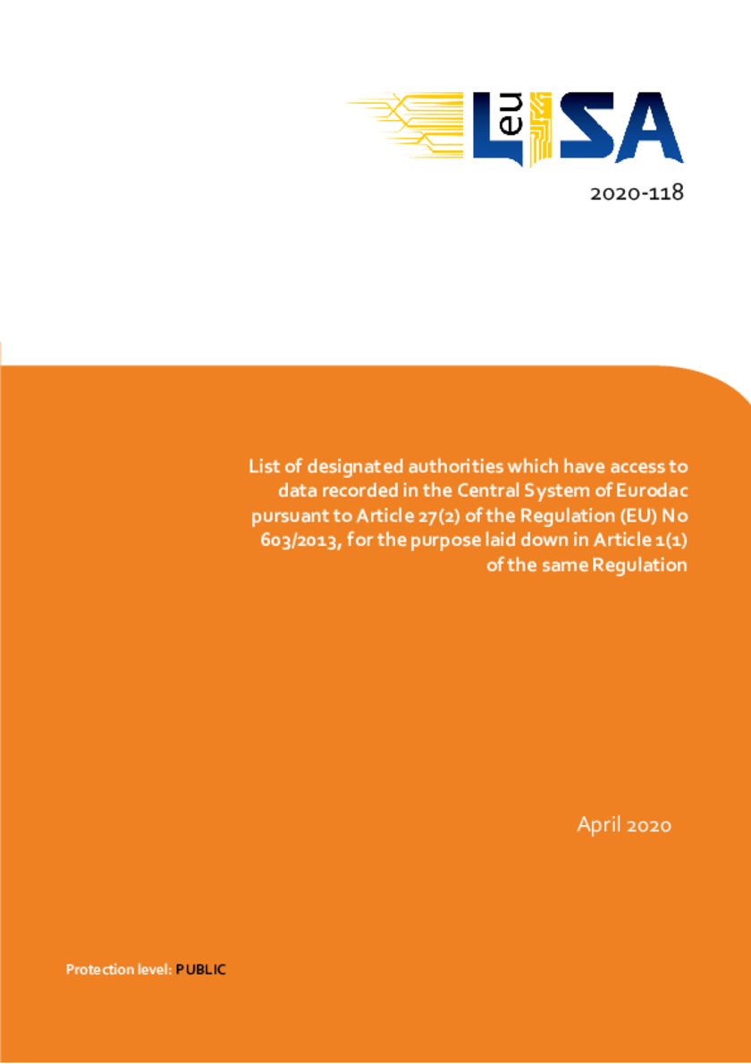 This is the list of designated authorities which have access to data recorded in the Central System of Eurodac pursuant to Article 27(2) of the Regulation (EU) No 603/2013, covering the purpose laid down in Article 1(1) of the same Regulation. The list was initially published on the OJ C237 on 20.07.2015. Where there are amendments thereto, the Agency shall publish once a year an updated consolidated list online. The present consolidated list is based on the list of designated authorities communicated by Member States by 3 March 2020.