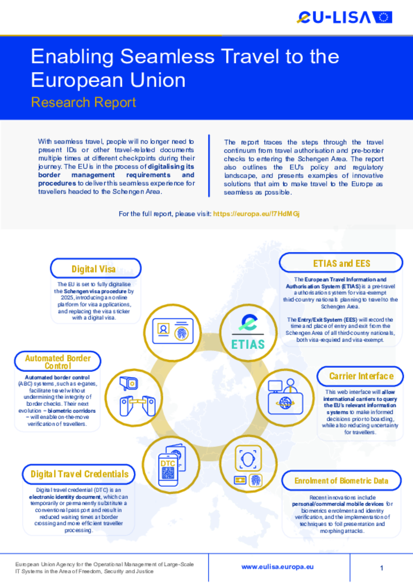 With seamless travel, people will no longer need to present IDs or other travel-related documents multiple times at different checkpoints during their journey. The EU is in the process of digitalising its border management requirements and procedures to deliver a seamless experience for travellers headed to the Schengen Area. The factsheet provides an overview of current and future digital landscape, and traces the steps through the travel continuum from travel authorisation and pre-border checks to entering the Schengen Area.