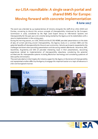 A single search portal and shared BMS for Europe Moving forward with concrete implementation The event was attended by 55 representatives of industry alongside the staff of eu-LISA, EASO and Frontex, convening to discuss the various concepts of interoperability introduced by the European Commission in 2016, considered by the High Level Expert Group on Information Systems and Interoperability for the