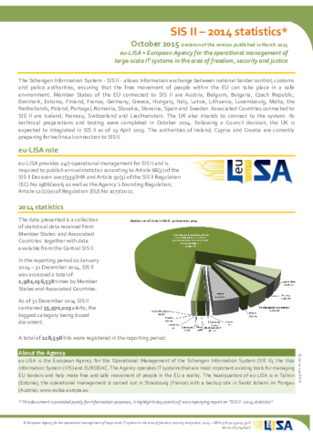 SIS II – 2014 Statistics is a public statistical document, published annually by eu-LISA, presenting a collection of data received from Member States and Associated Countries connected to SIS II together with data available from the Central SIS II, as requested by the legal instruments governing the system. This version of the document was revised in October 2015.