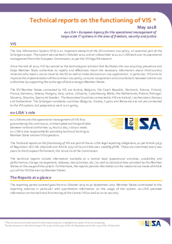 Report on the technical functioning of Visa Information System, including aspects related to the Biometric Matching System. This report details the activities implemented over the last two years to ensure the operational management of VIS.